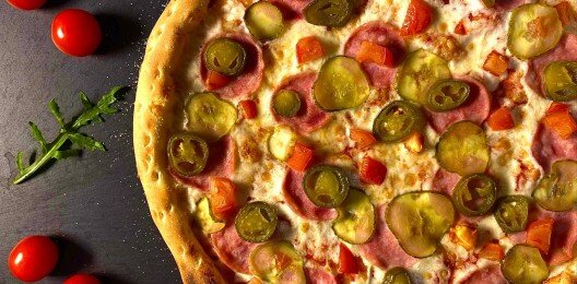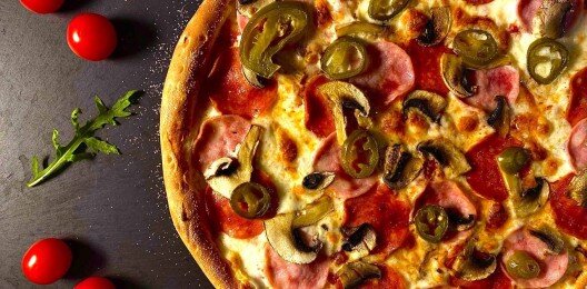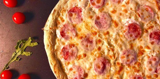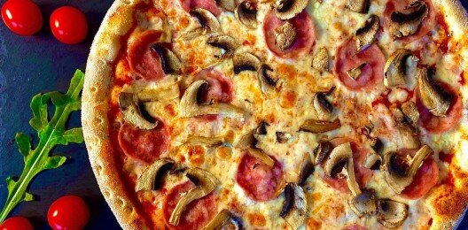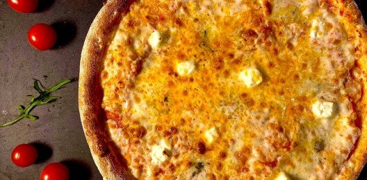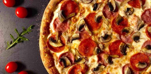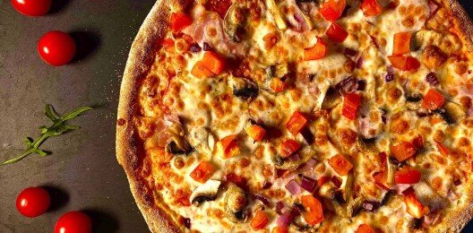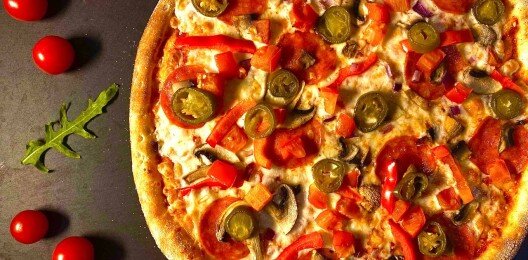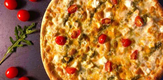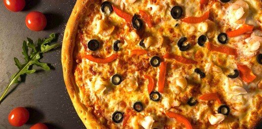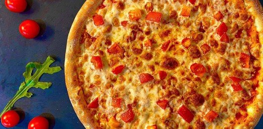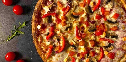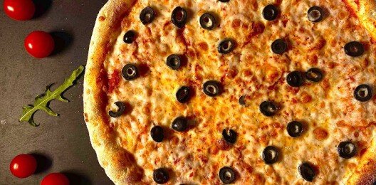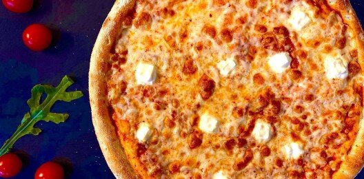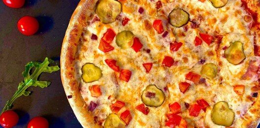 Пицца-соус, сыр моцарелла, шампиньоны, сыр фета, сладкий перец, красный лук, маслины, томаты