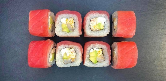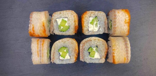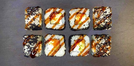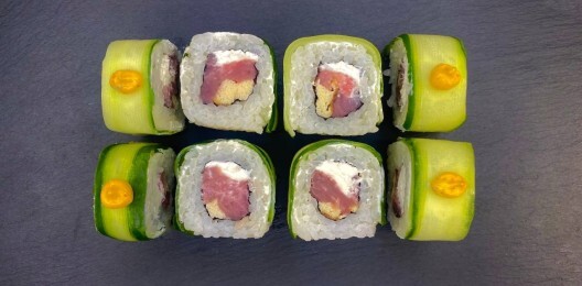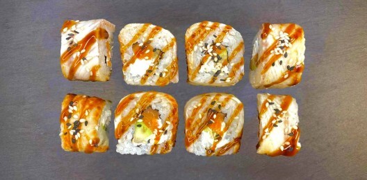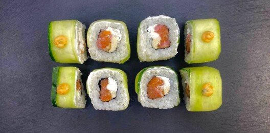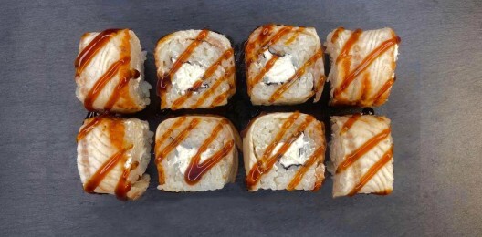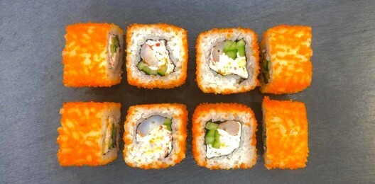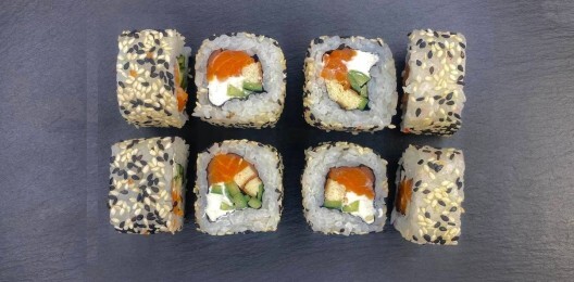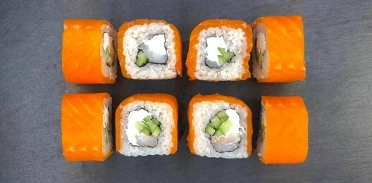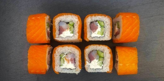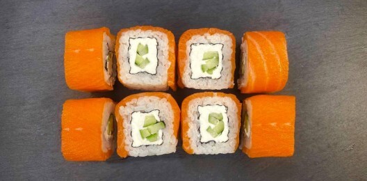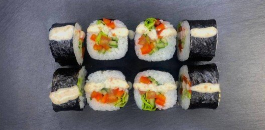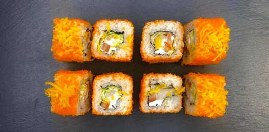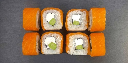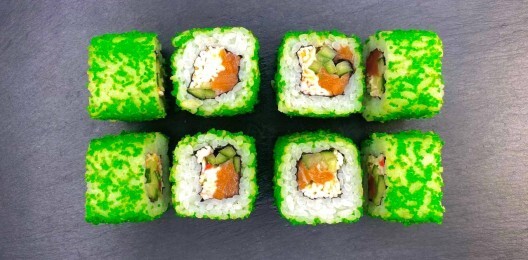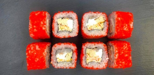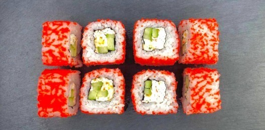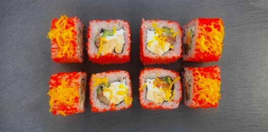 Нори, рис, курица, салат айсберг, сыр чеддер, томат, соус цезарь (в комплекте к роллу идет 1 набор (палочки, соевый соус, имбирь, васаби)