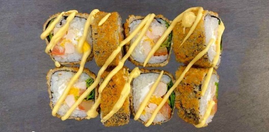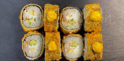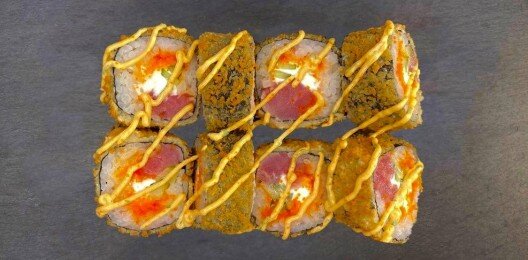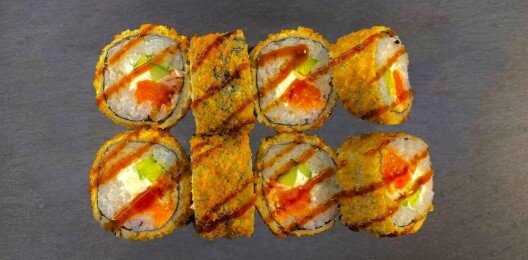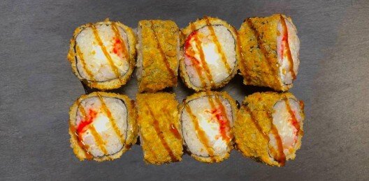 Нори, рис, угорь, икра масаго, авокадо, творожный сыр, сухари панко, ореховый соус (в комплекте к роллу идет 1 набор (палочки, соевый соус, имбирь, васаби)
