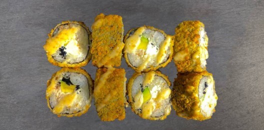 Нори, рис, курица, салат айсберг, сыр чеддер, томат, соус цезарь, сухари панко, сырный соус (в комплекте к роллу идет 1 набор (палочки, соевый соус, имбирь, васаби)